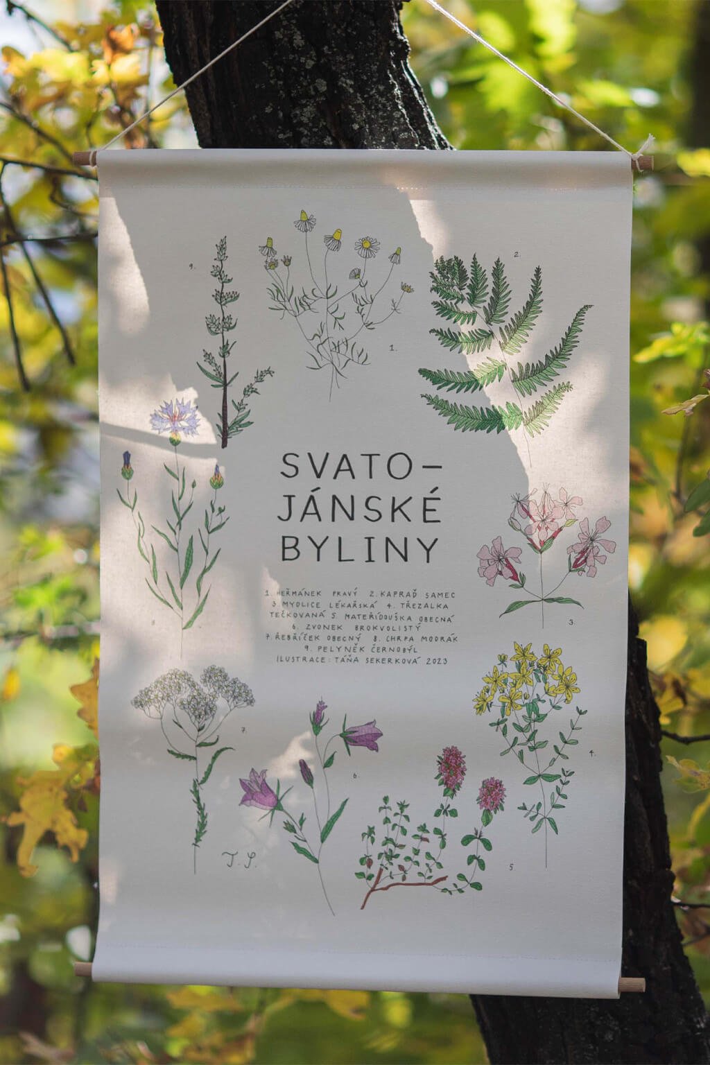 Autorská ilustrácia svätojánskych bylín vytlačená na plátne ako krásna dekorácia na stenu.
