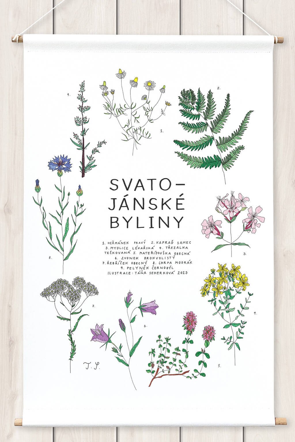 Zobrazené svätojánske byliny: harmanček pravý, papraď samčia, mydlica lekárska, ľubovník bodkovaný, dúška materina, zvonček broskvolistý, rumanček obyčajný, nechtík modrý, palina čierna