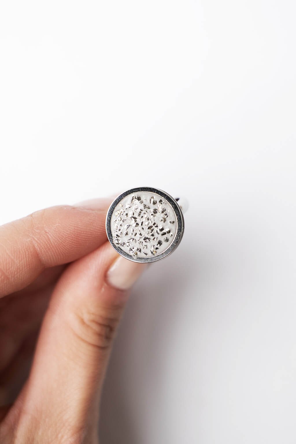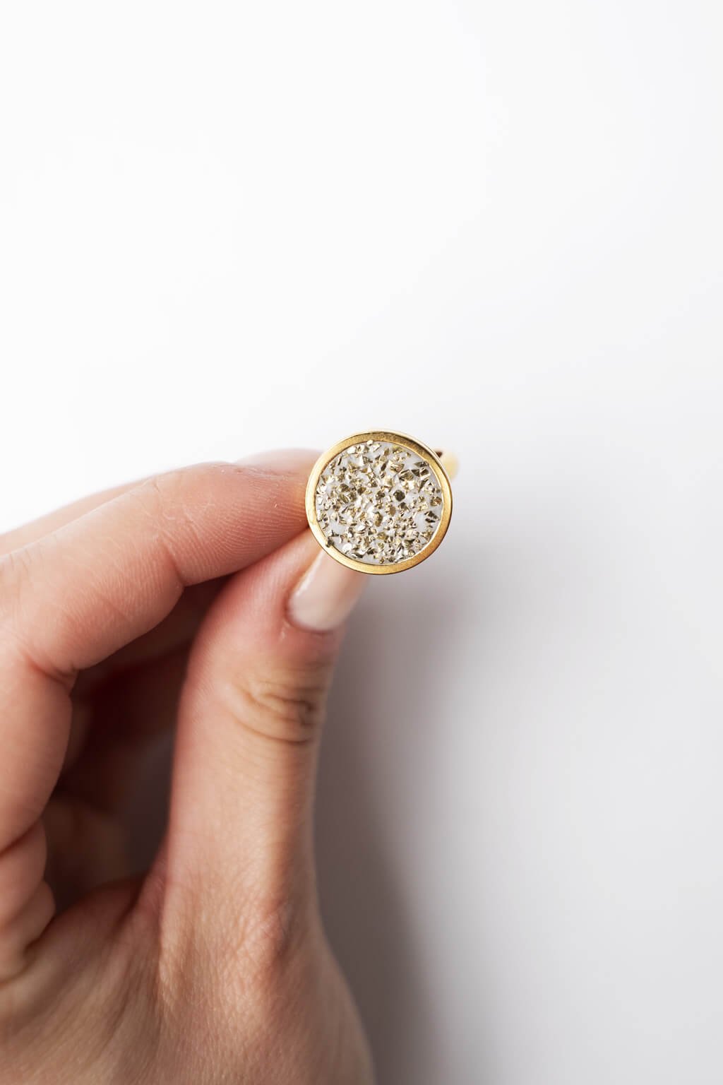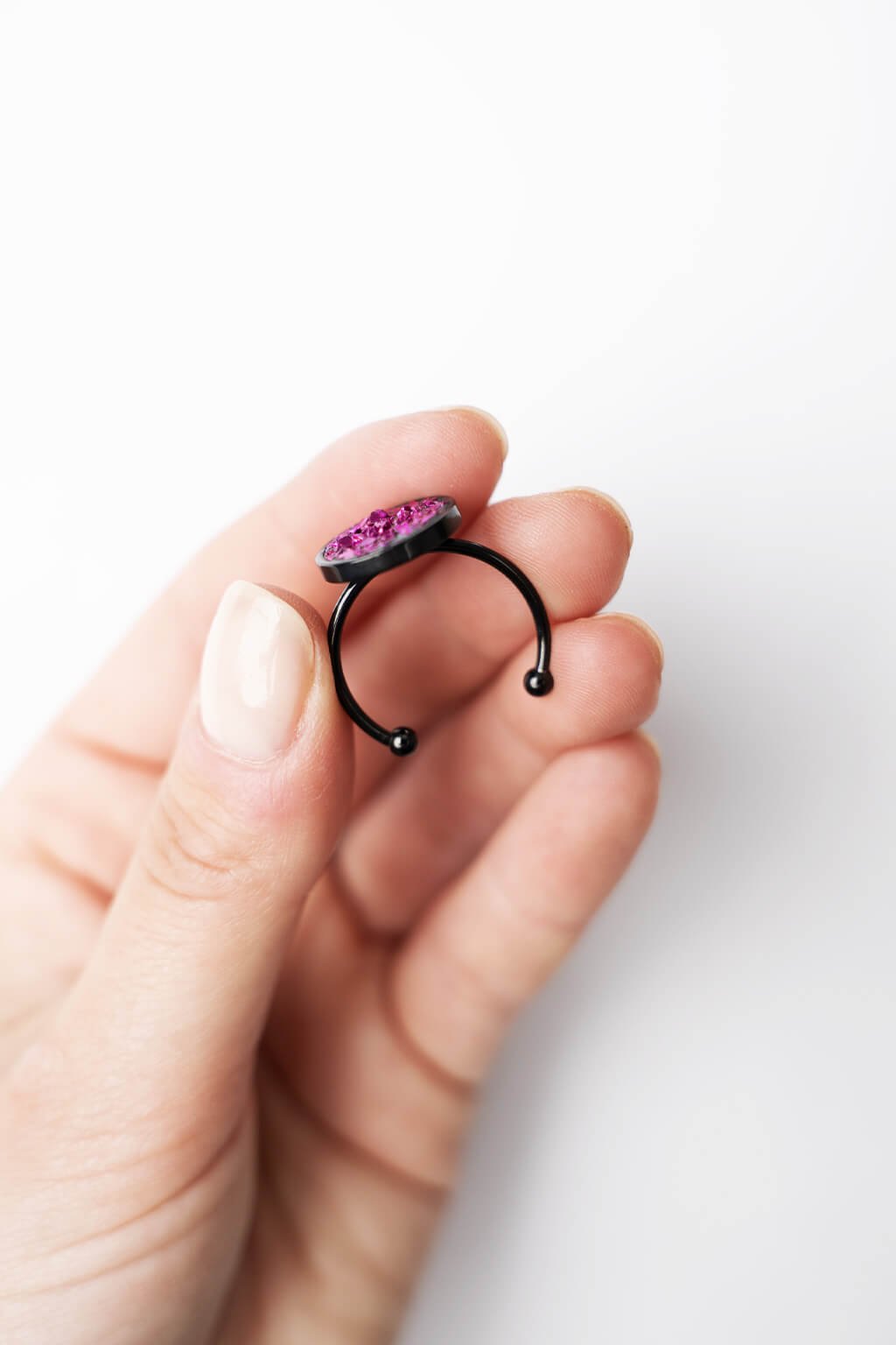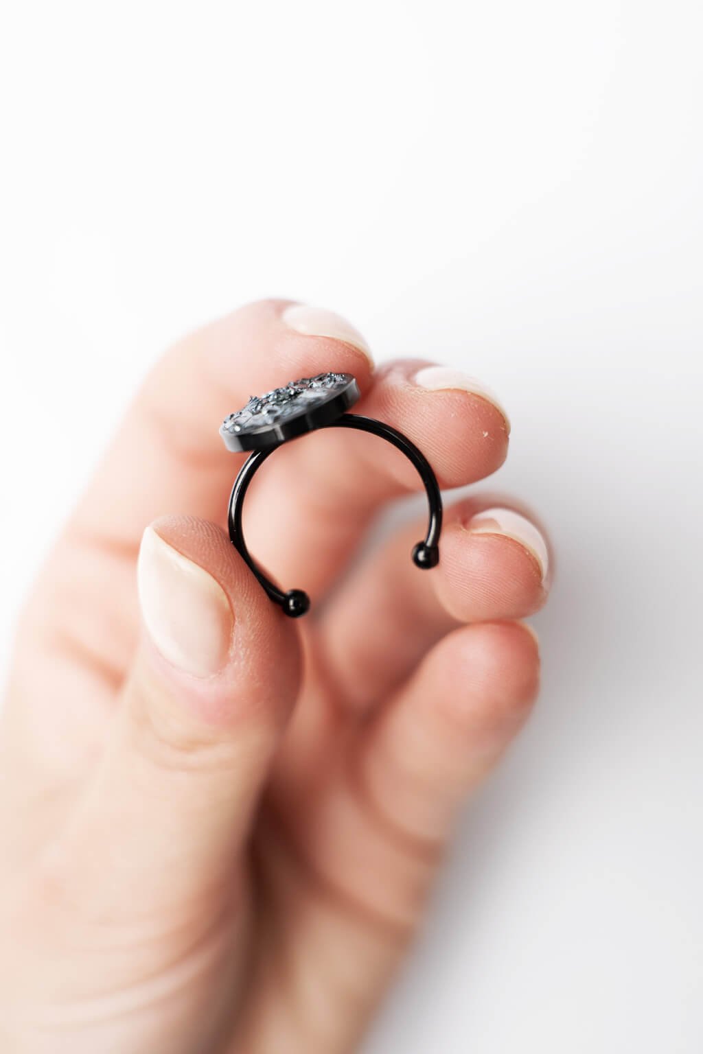 Roztiahnuteľné prevedenie zaisťuje, že prsteň sadne takmer na každý prst, takže sa nemusíte trápiť výberom veľkosti. Priemer 15 mm vytvára jemne výraznú plochu pre detail, ktorý zaujme – trblietky zaliate v živici krásne zachytávajú svetlo a dodávajú celku jemný lesk.