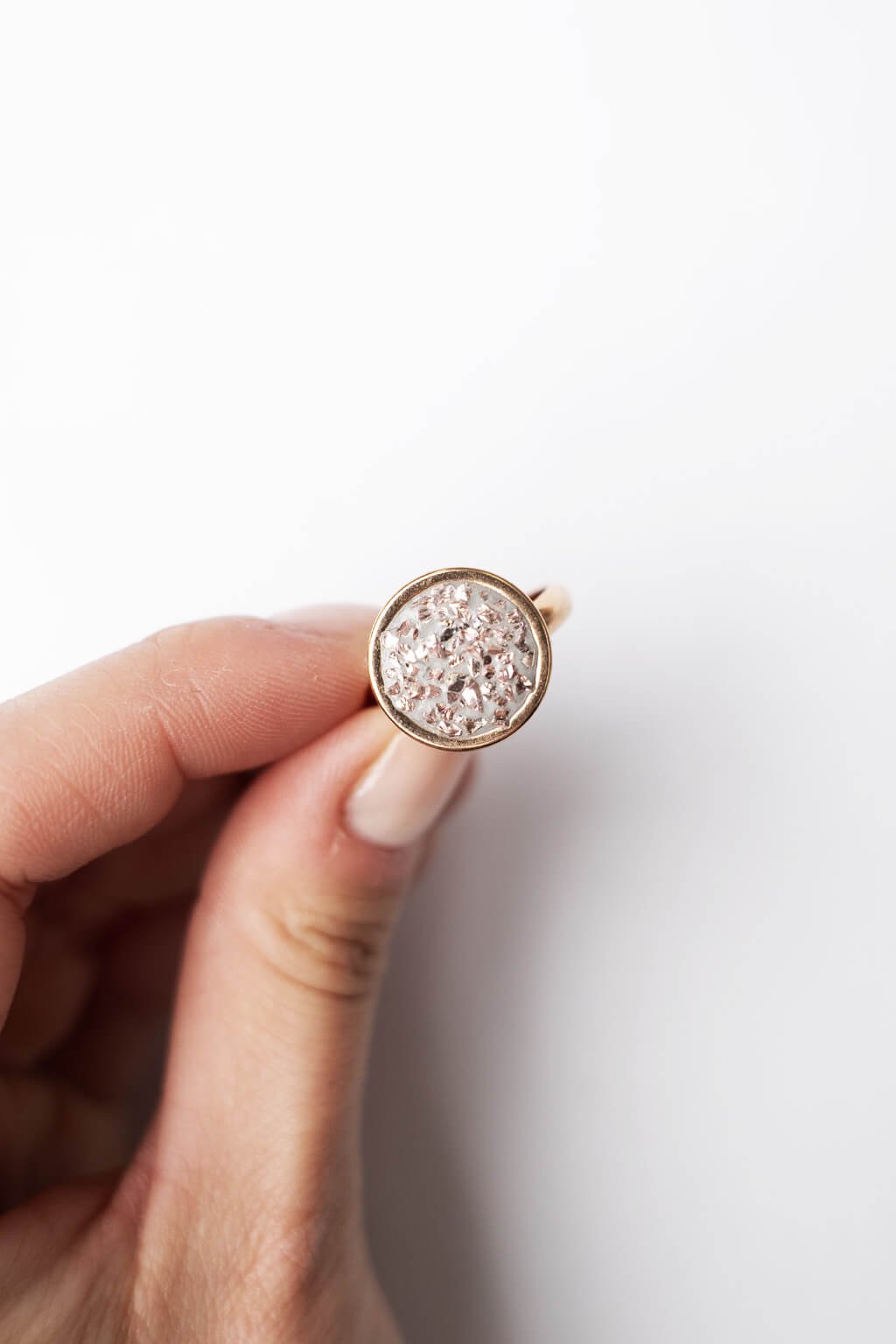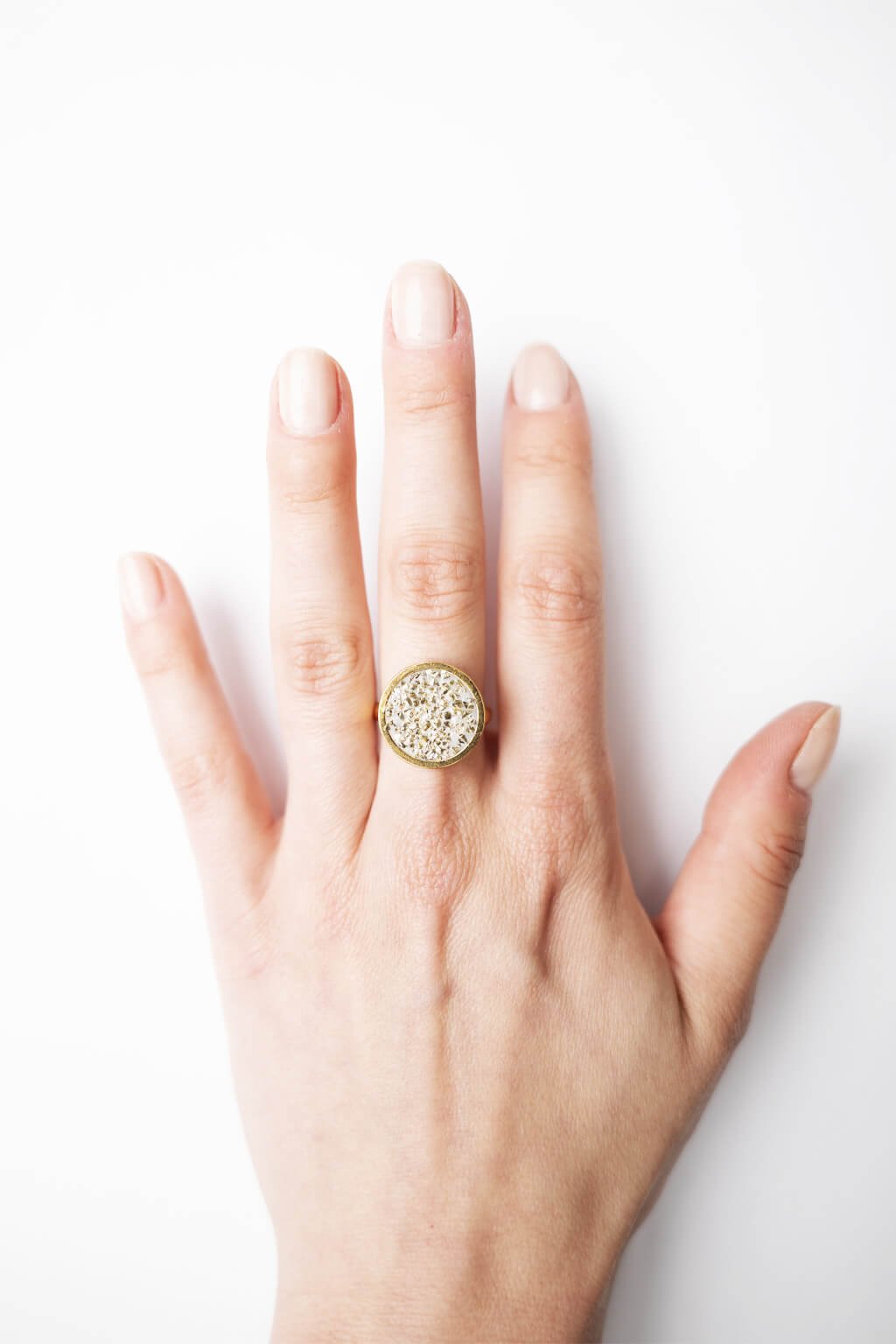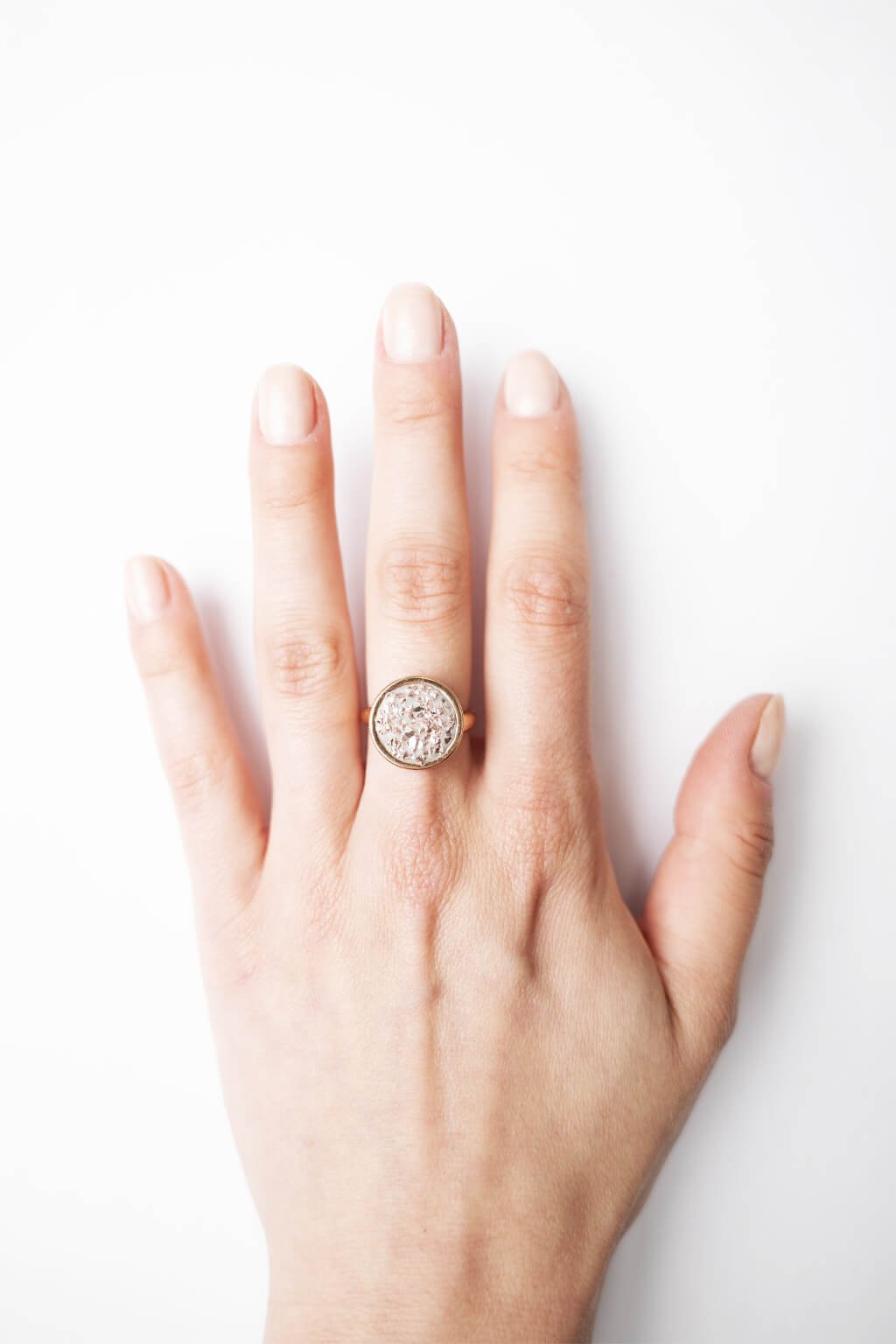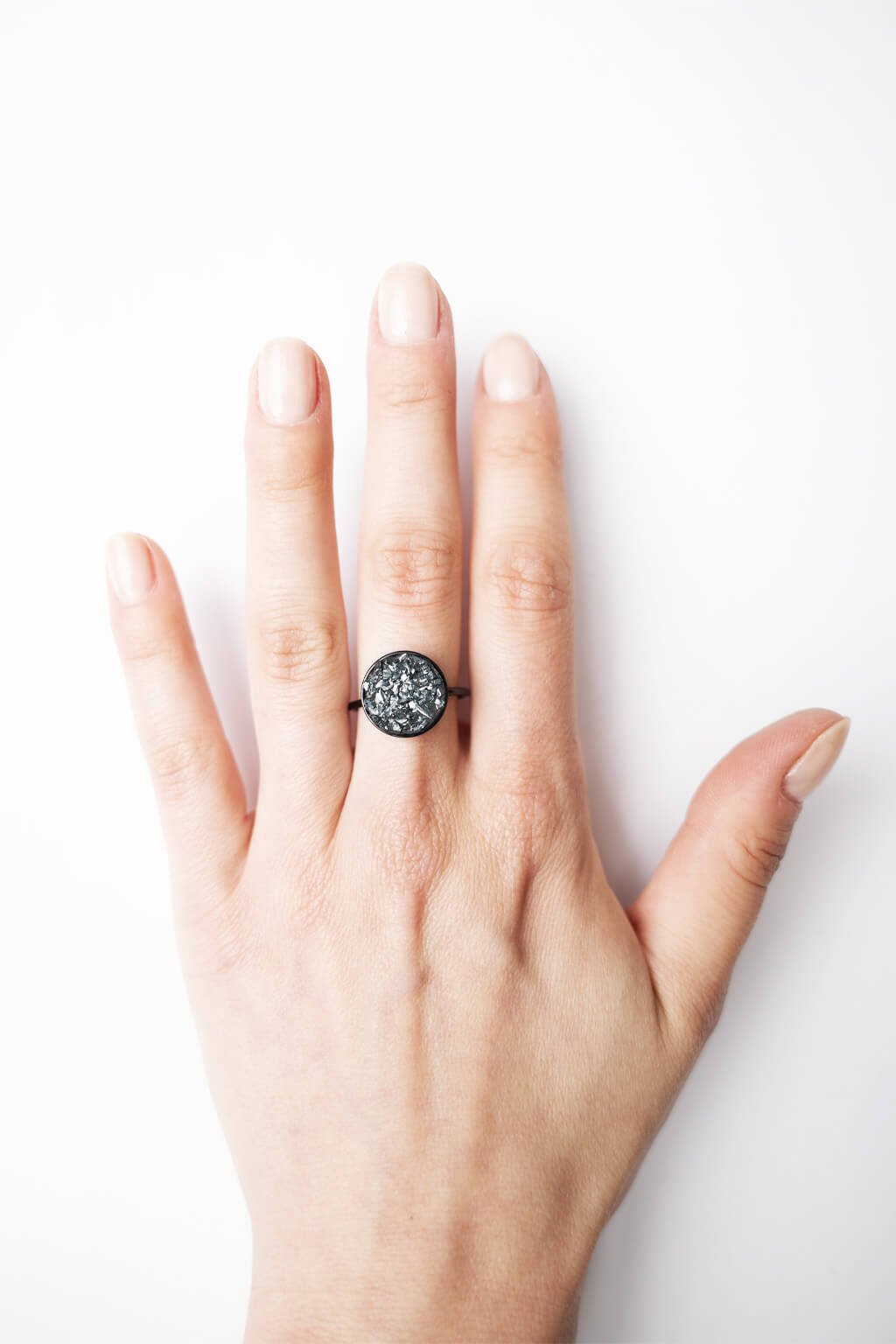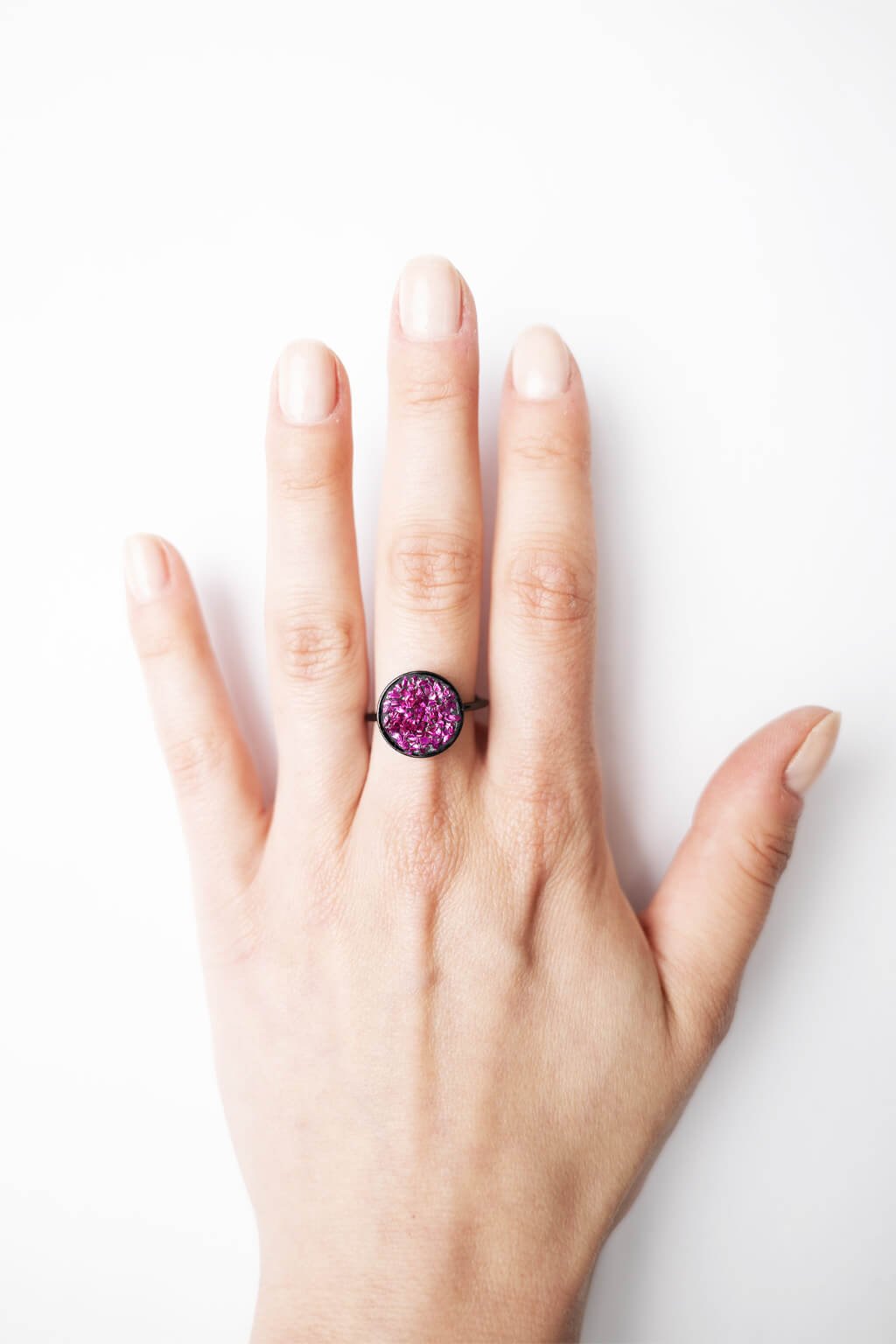 Roztiahnuteľné prevedenie zaisťuje, že prsteň sadne takmer na každý prst, takže sa nemusíte trápiť výberom veľkosti. Priemer 15 mm vytvára jemne výraznú plochu pre detail, ktorý zaujme – trblietky zaliate v živici krásne zachytávajú svetlo a dodávajú celku jemný lesk.