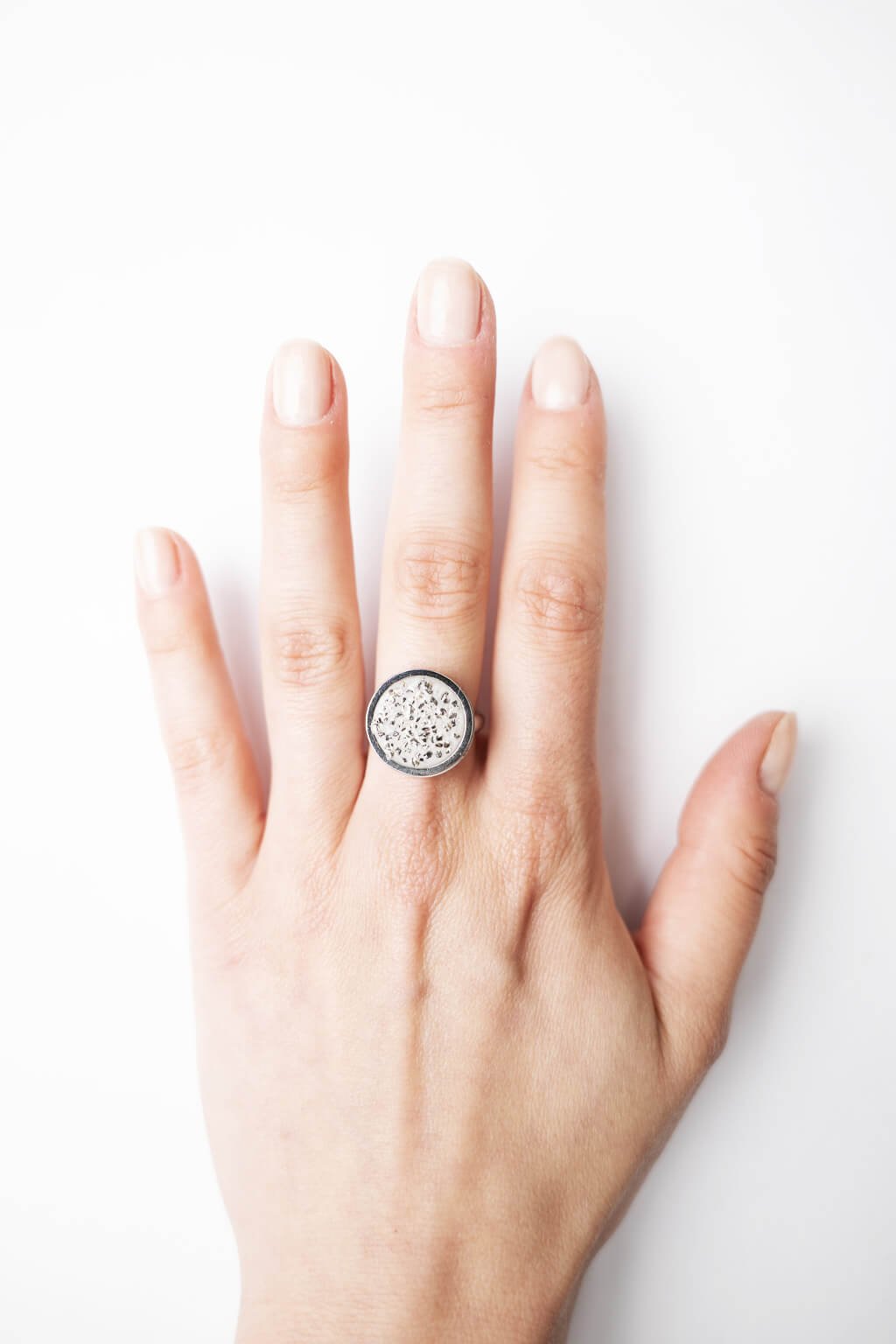 Jednoduchý, ale predsa neprehliadnuteľný. Tento prsteň vznikol z netradičnej kombinácie šperkárskeho betónu a nehrdzavejúcej ocele – a práve vďaka tomu má svoj špecifický, surovo elegantný charakter. Každý kúsok je trochu iný, každý má svoj príbeh.