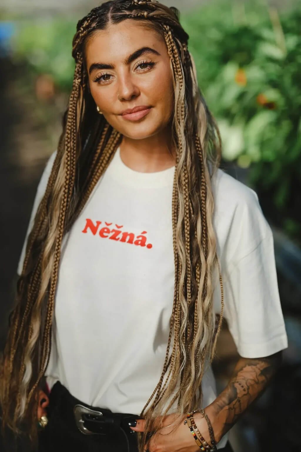 Vyrobené z ekologického textilu, s ručne vyšívaným nápisom “Nežná” na hrudi a jemným posolstvom na chrbte, je dokonalým vyjadrením modernej ženy – nezávislej, odvážnej a elegantnej. Každý detail je starostlivo vyšitý u nás na západe, s láskou k remeslu aj prírode.