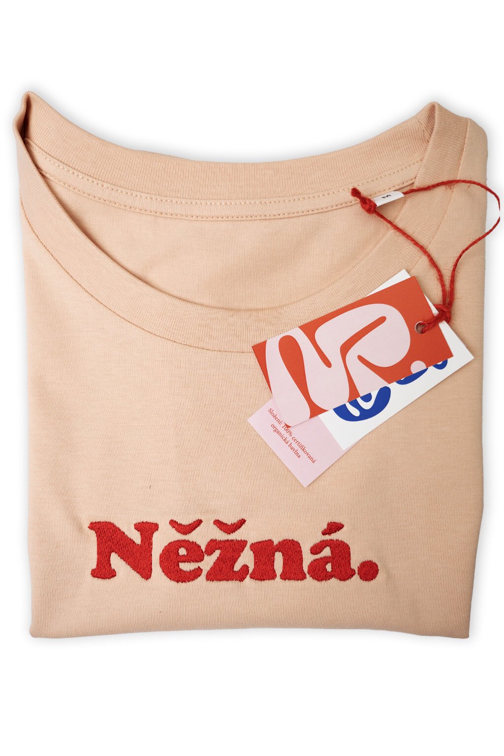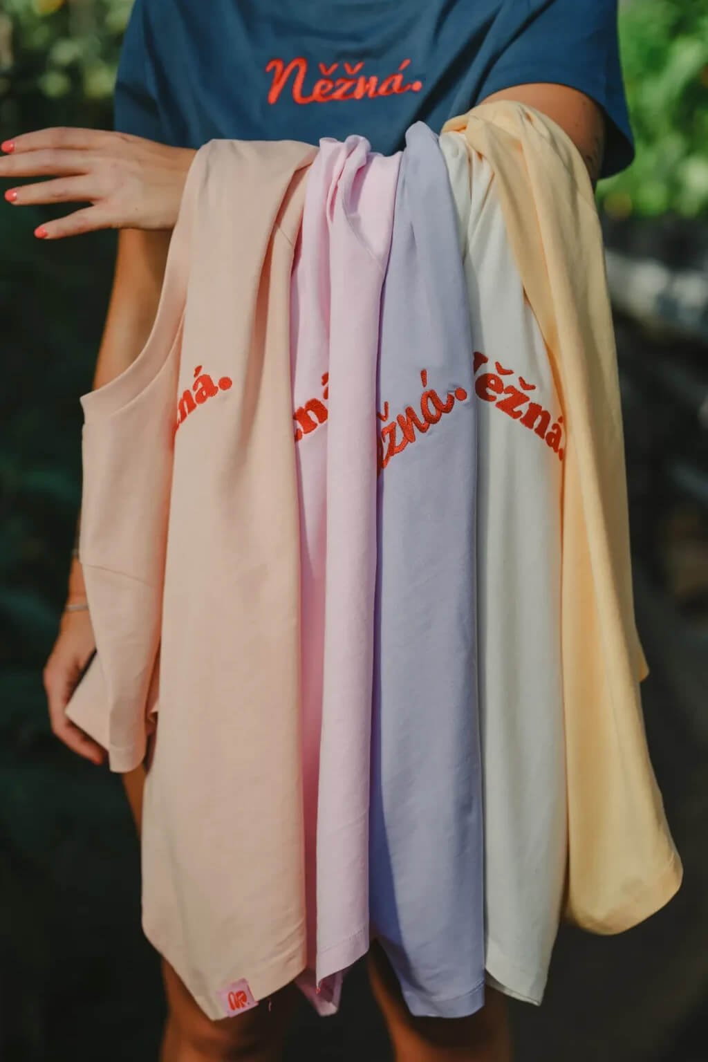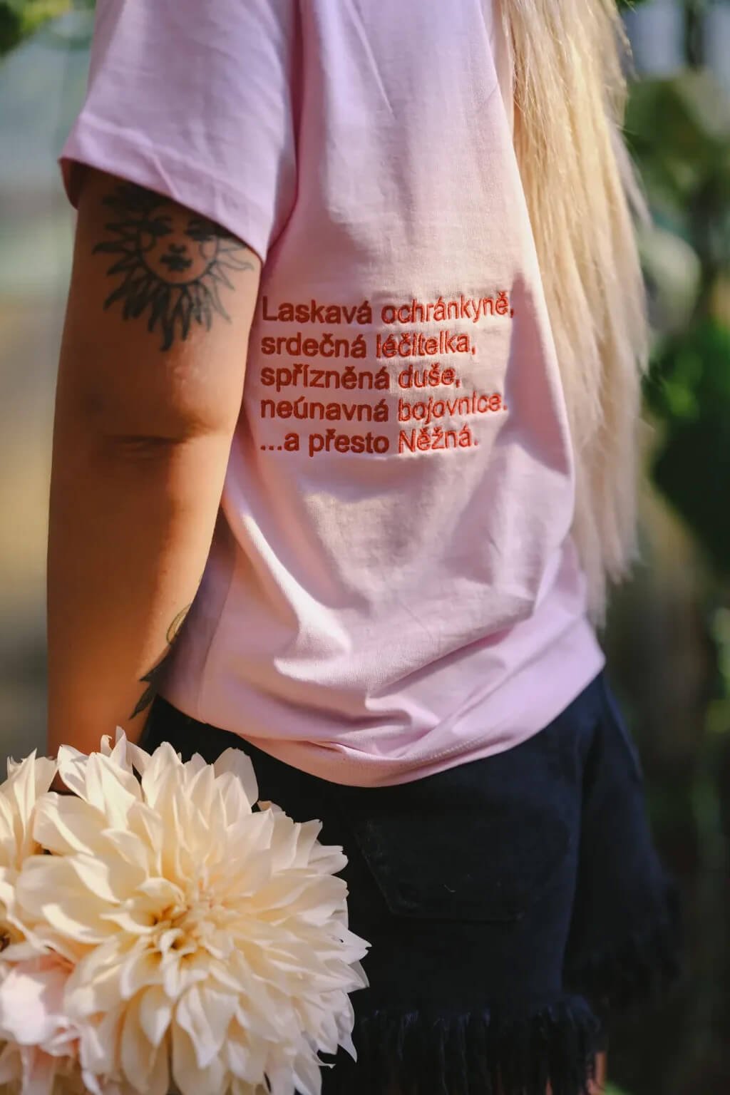 Pastelové tričko Něžná z ekologického textilu oslavuje nežnú silu modernej ženy – krásnej a nezávislej. S prednou výšivkou “Něžná” a jemným posolstvom na chrbte, všetko ručne vyšívané tu u nás na západe. Veľkosti nájdete v galérii fotiek.