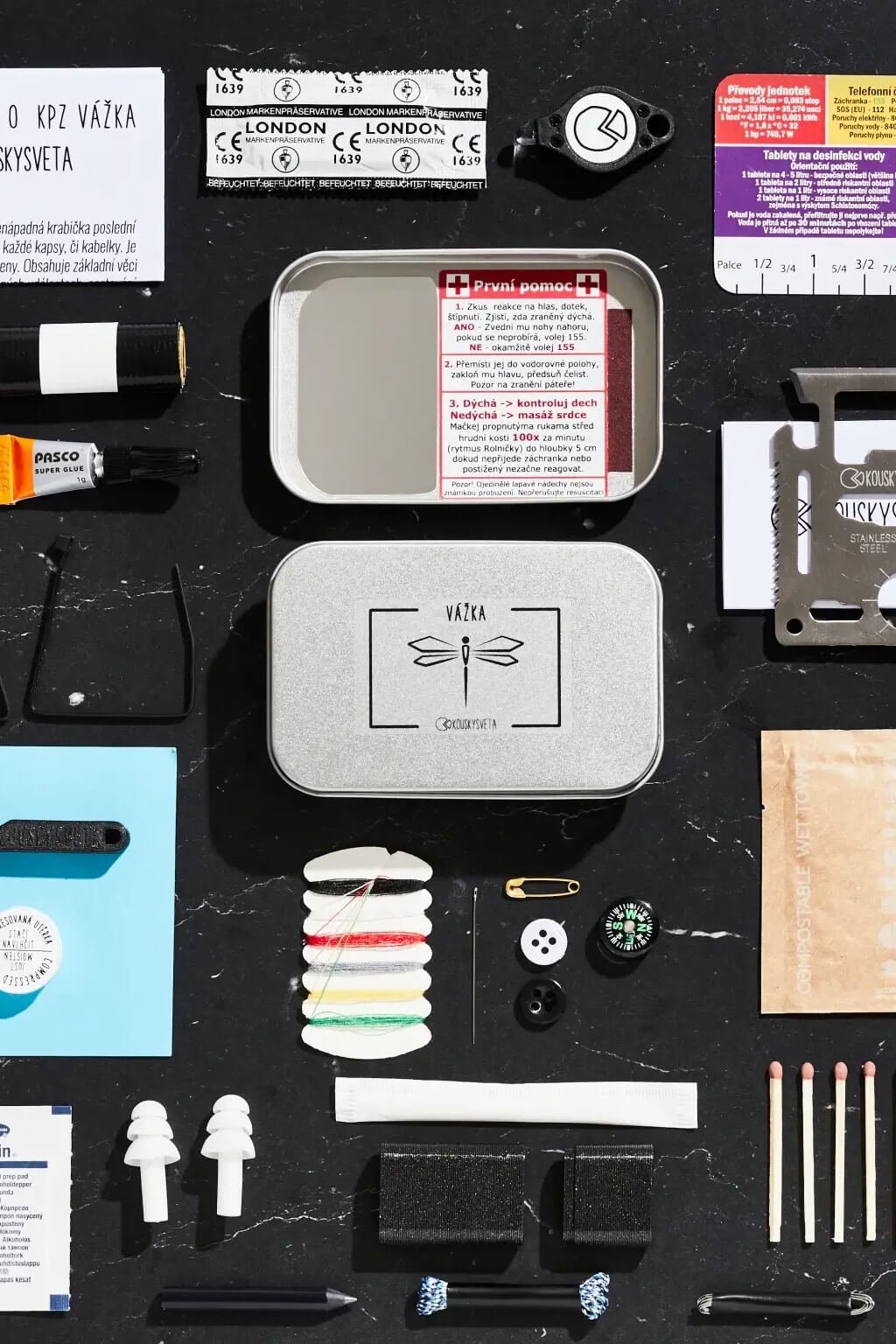 Krabička poslednej záchrany od značky Kousky světa. Obsahuje všetko nevyhnutné pre mesto aj prírodu v ultra ľahkom prevedení.