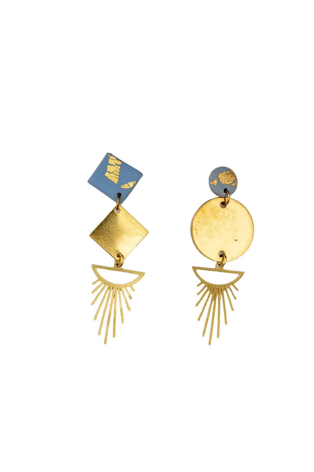 Čisté línie, abstraktné tvary a kvapka extravagancie, to sú hlavné atribúty týchto originálnych náušníc. Svojou výraznosťou a farebnosťou vnesú nezameniteľný štýl každému outfitu. Zaujmite svojou originalitou a doplňte svoj look týmto výnimočným kúskom vyrobeným z modrého polyméru, s kvapkou zlata a z mosadze.