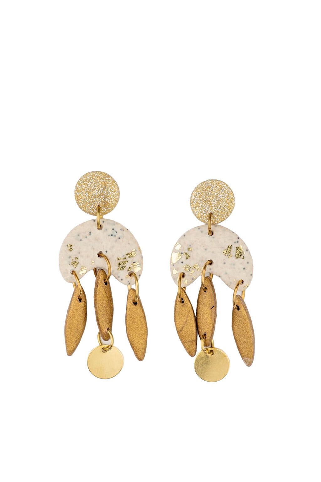 Čisté línie, abstraktné tvary a kvapka extravagancie, to sú hlavné atribúty týchto originálnych náušníc. Svojou decentnou výraznosťou a farebnosťou vnesú nezameniteľný štýl každému outfitu. Zaujmite svojou originalitou a doplňte svoj look týmto výnimočným kúskom vyrobeným z polyméru pieskových farieb, s kvapkou zlata a z mosadze.