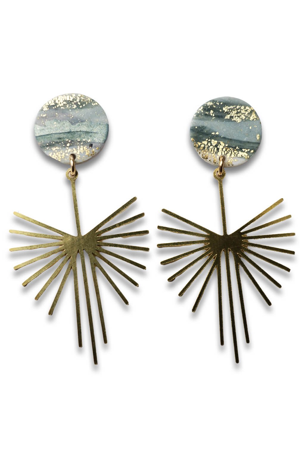 Čisté línie, abstraktné tvary a kvapka extravagancie, to sú hlavné atribúty týchto originálnych náušníc. Svojou výraznosťou a farebnosťou vnesú nezameniteľný štýl každému outfitu. Zaujmite svojou originalitou a doplňte svoj look týmto výnimočným kúskom vyrobeným z modrozeleného polyméru s kvapkou zlata a z mosadze.