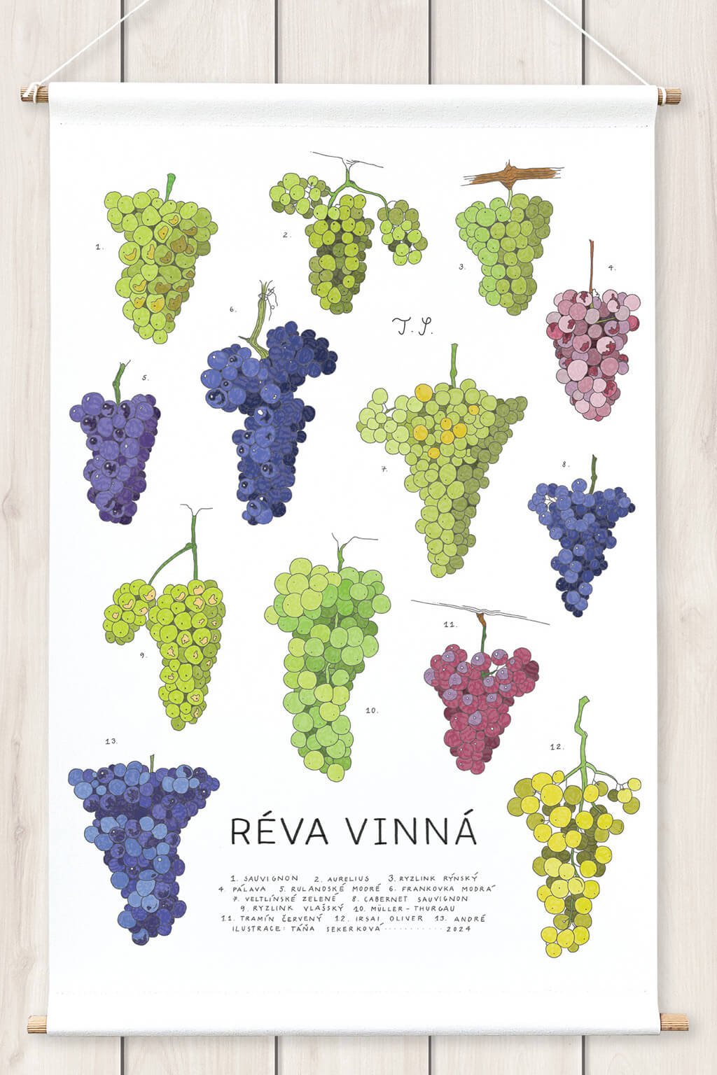 Krásna autorská ilustrácia českých odrôd vínnej révy od ilustrátorky Táni Sekerkovej.