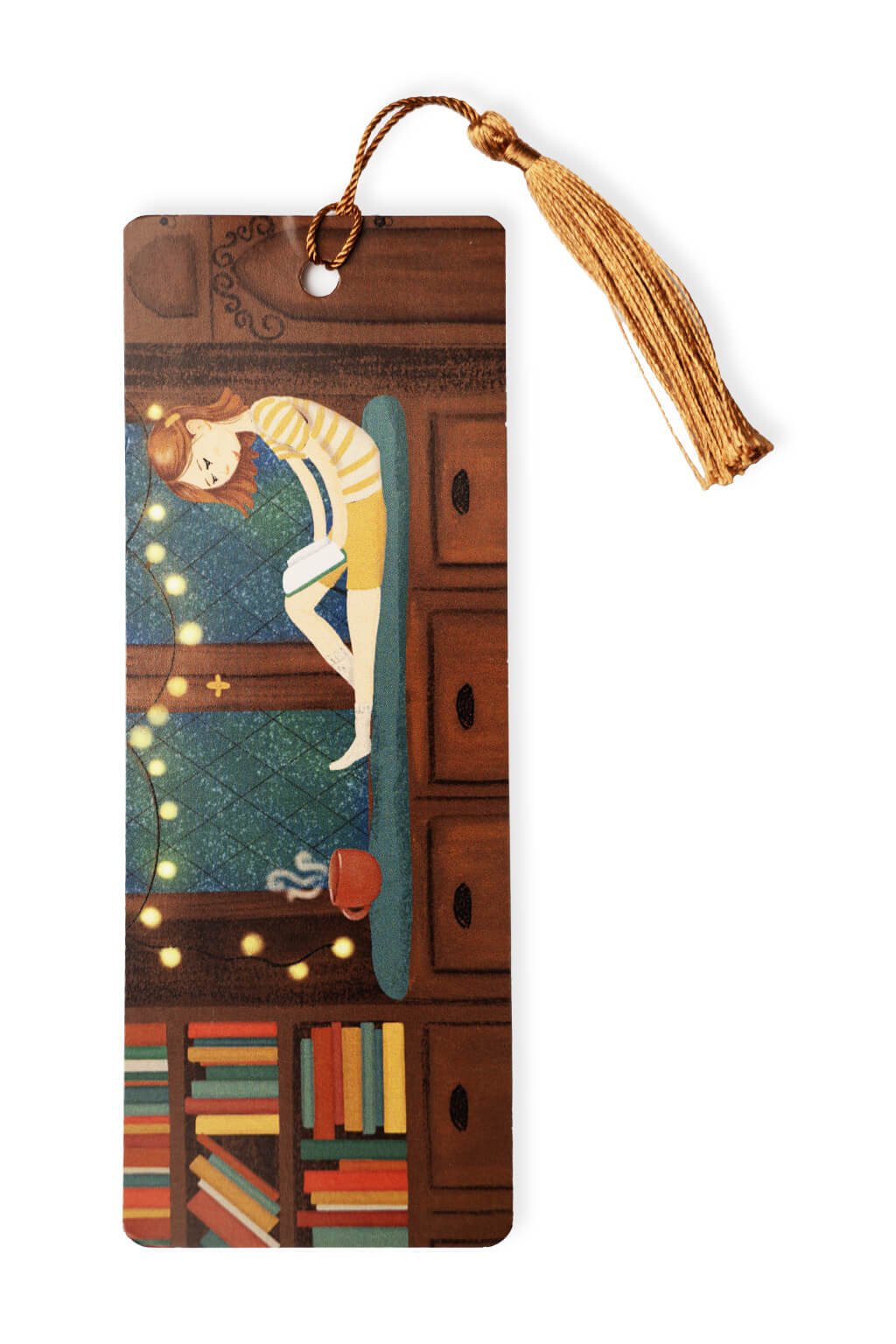 Papierová záložka s autorským motívom malej čitateľky pri okne od Sandry Kocmanovej prenesie každé čítanie do čarovného sveta príbehov.
