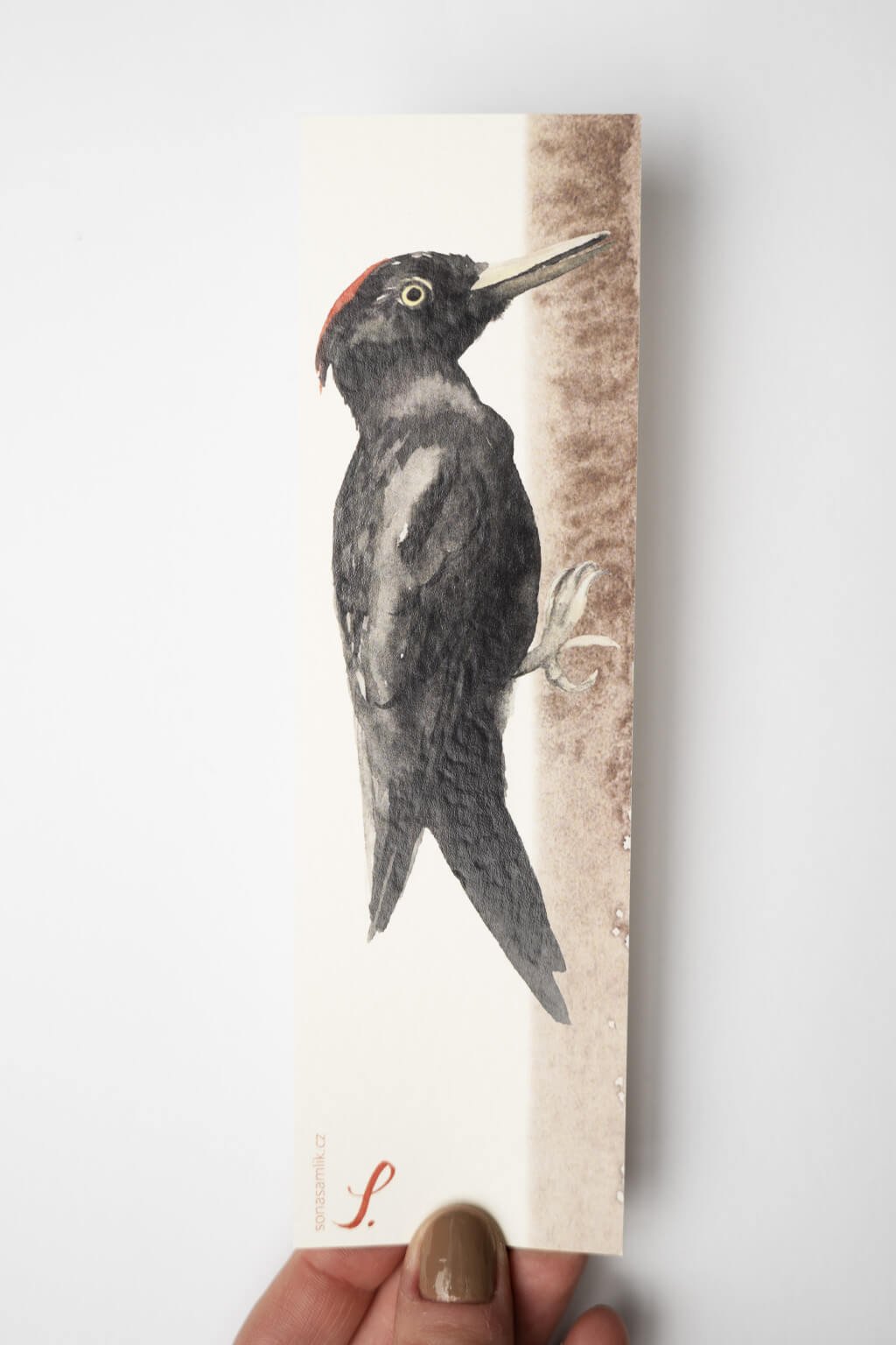 Knižná záložka s jedinečným autorským motívom ďatľa, namaľovaným technikou akvarelu.