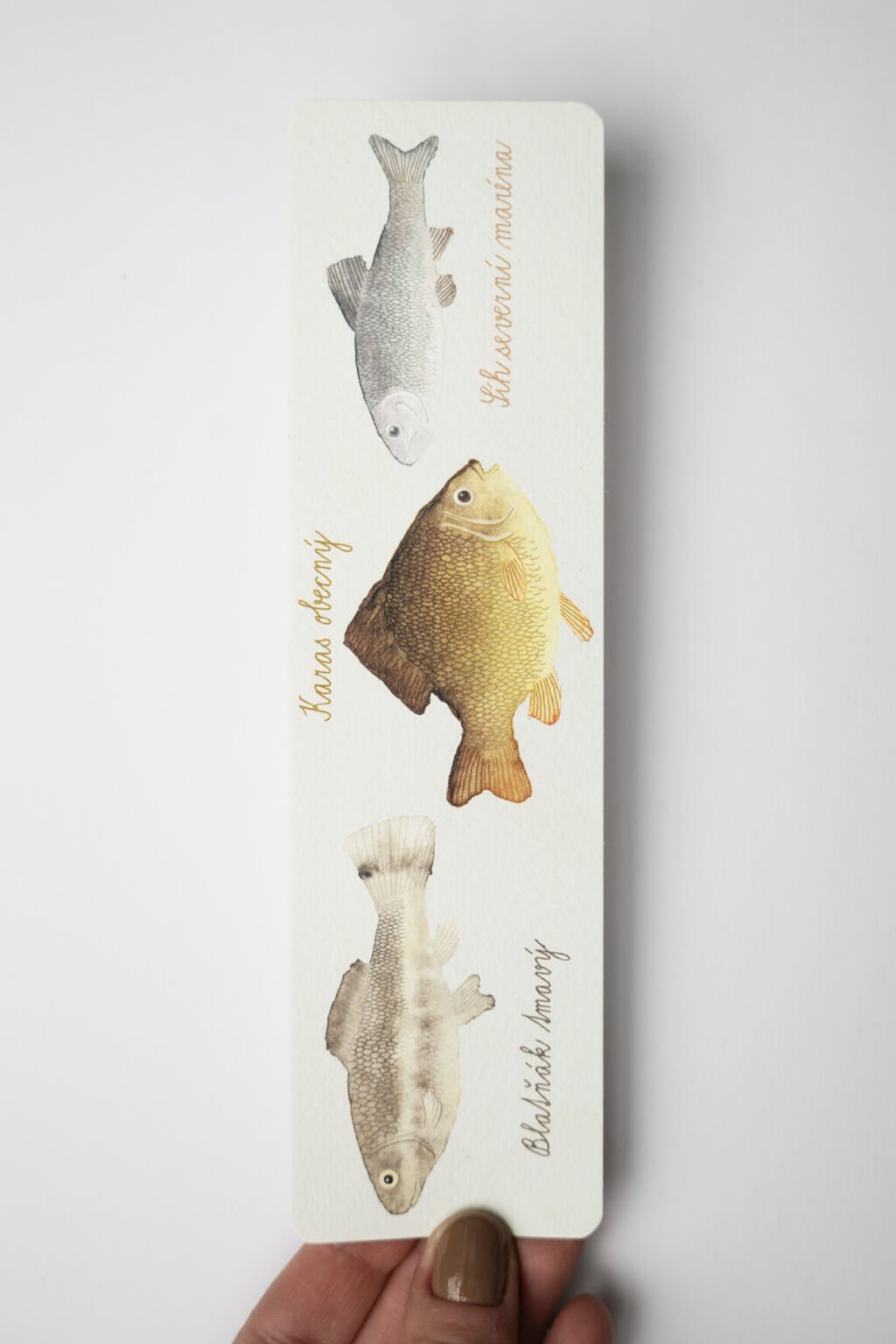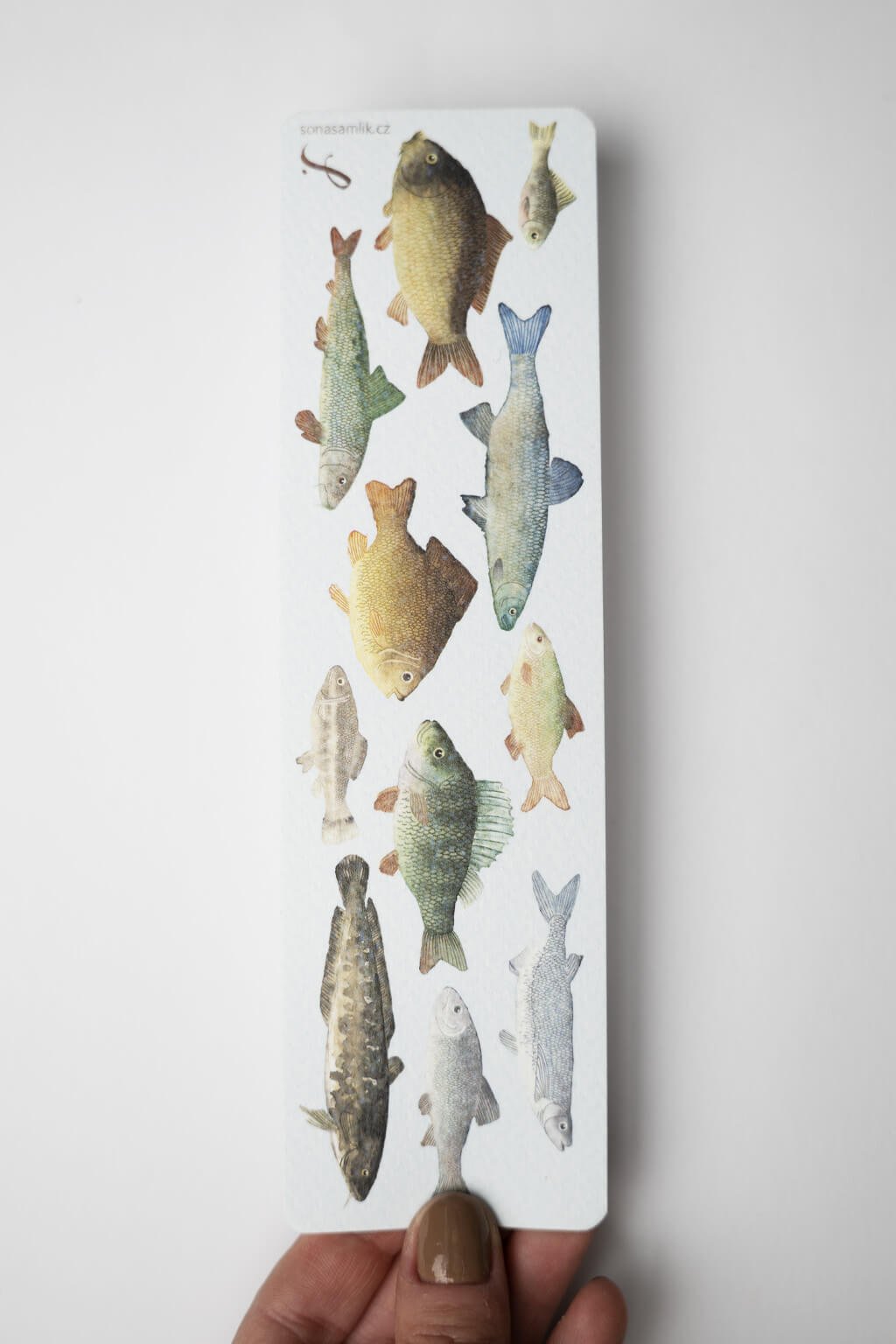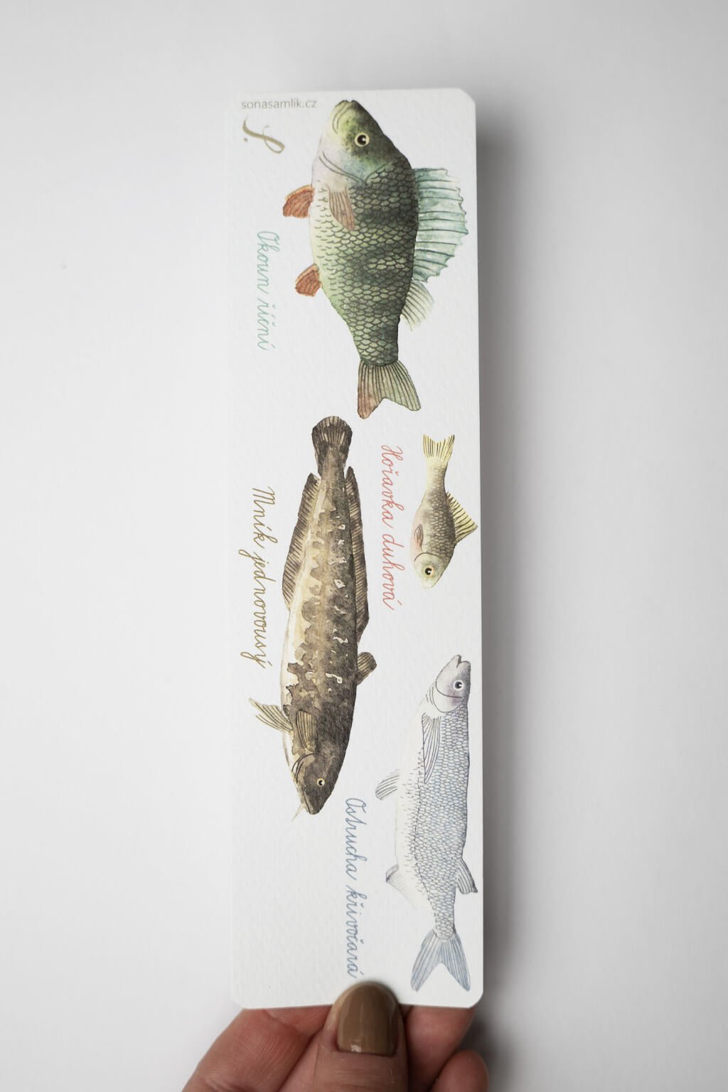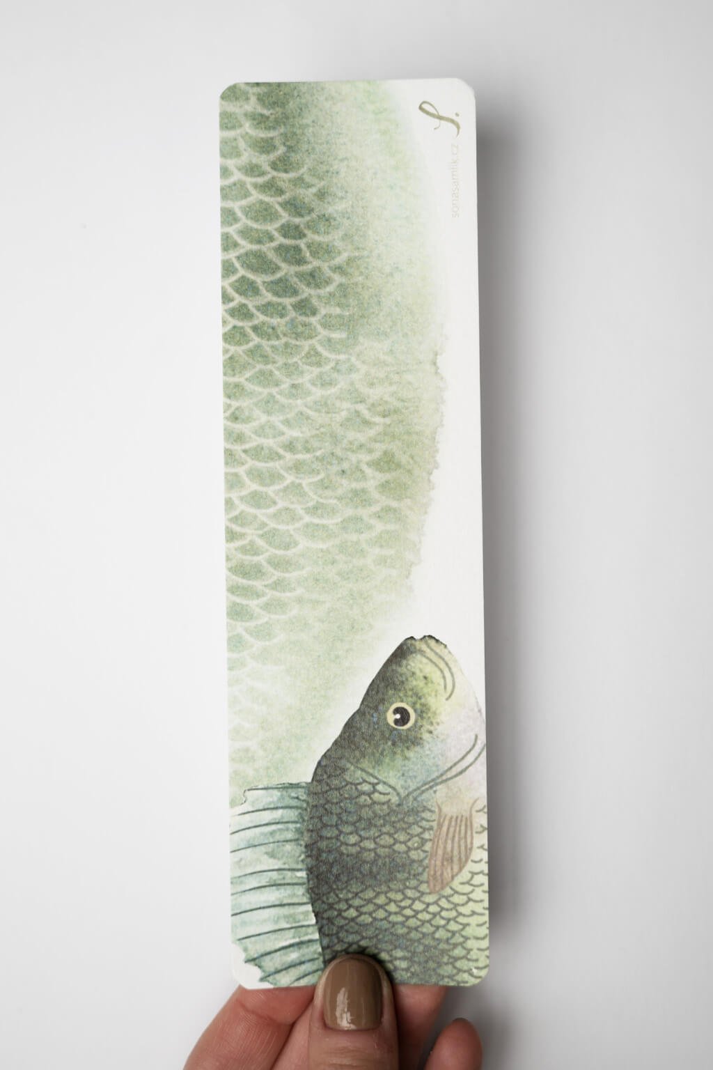 Knižná záložka s jedinečným autorským motívom rýb, namaľovanou technikou akvarelu.