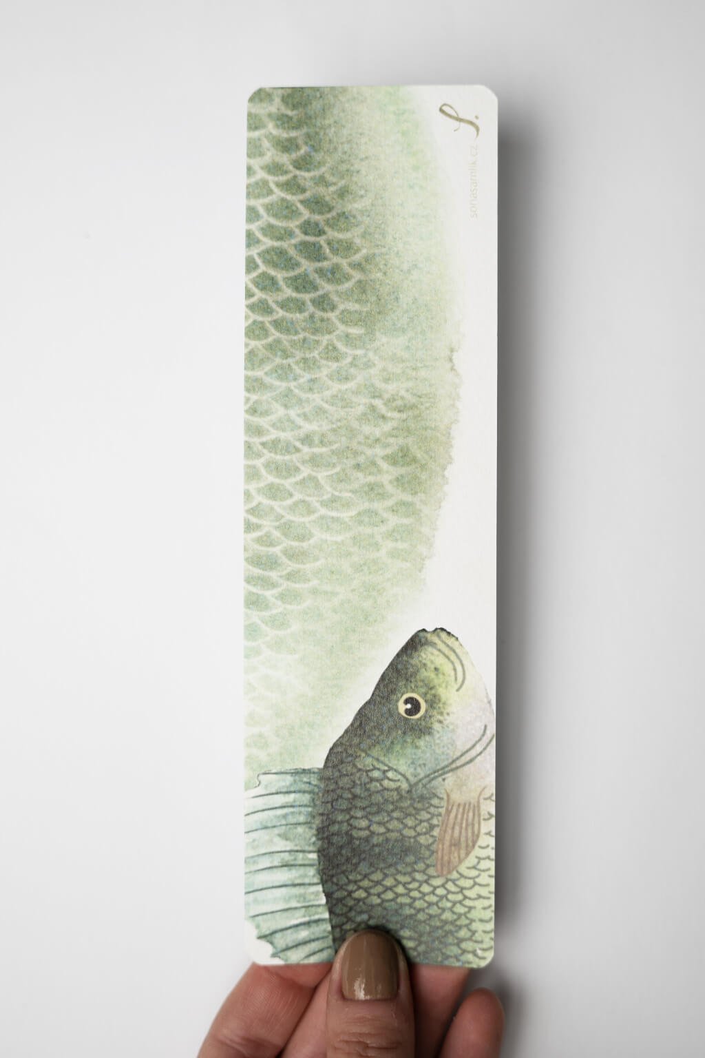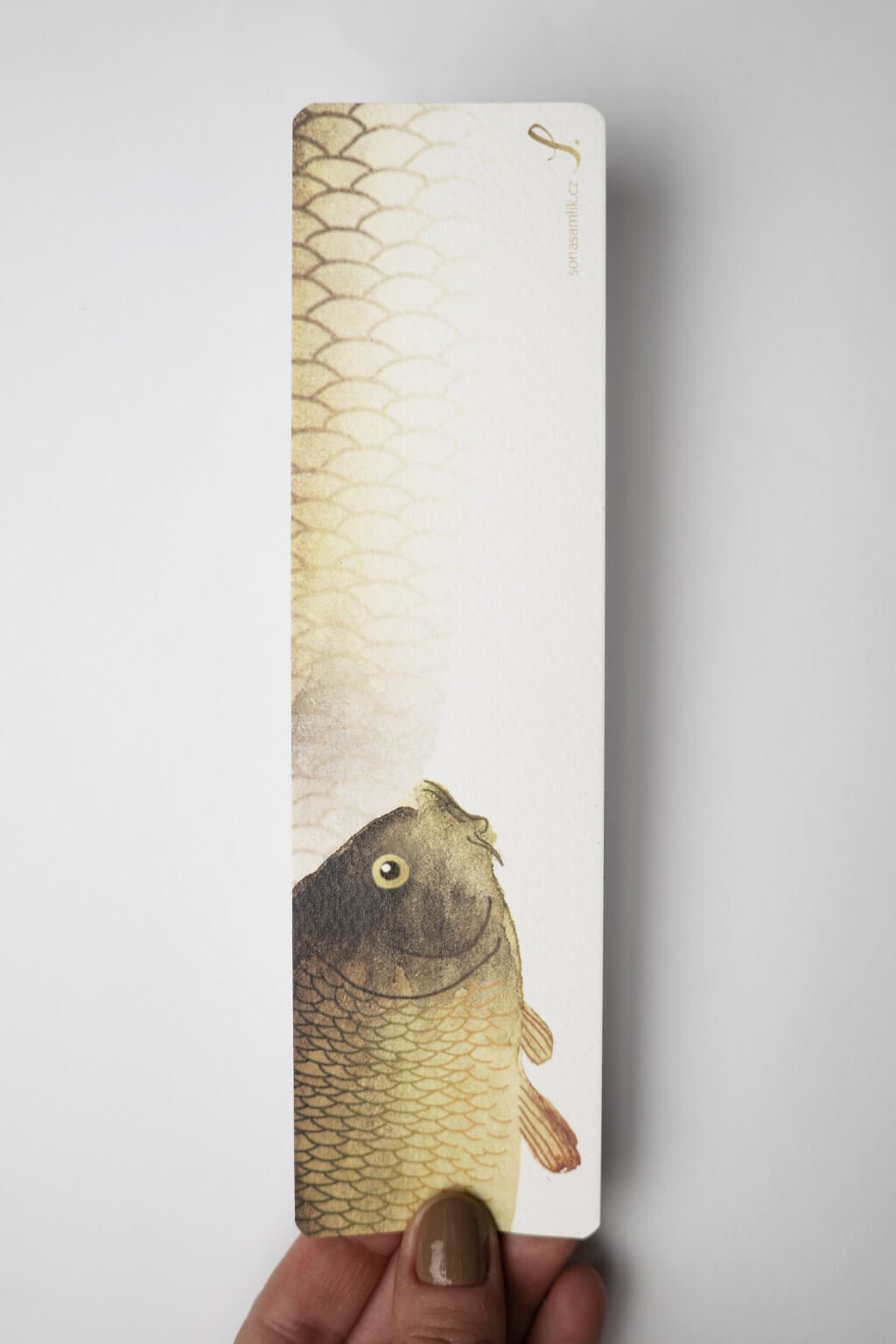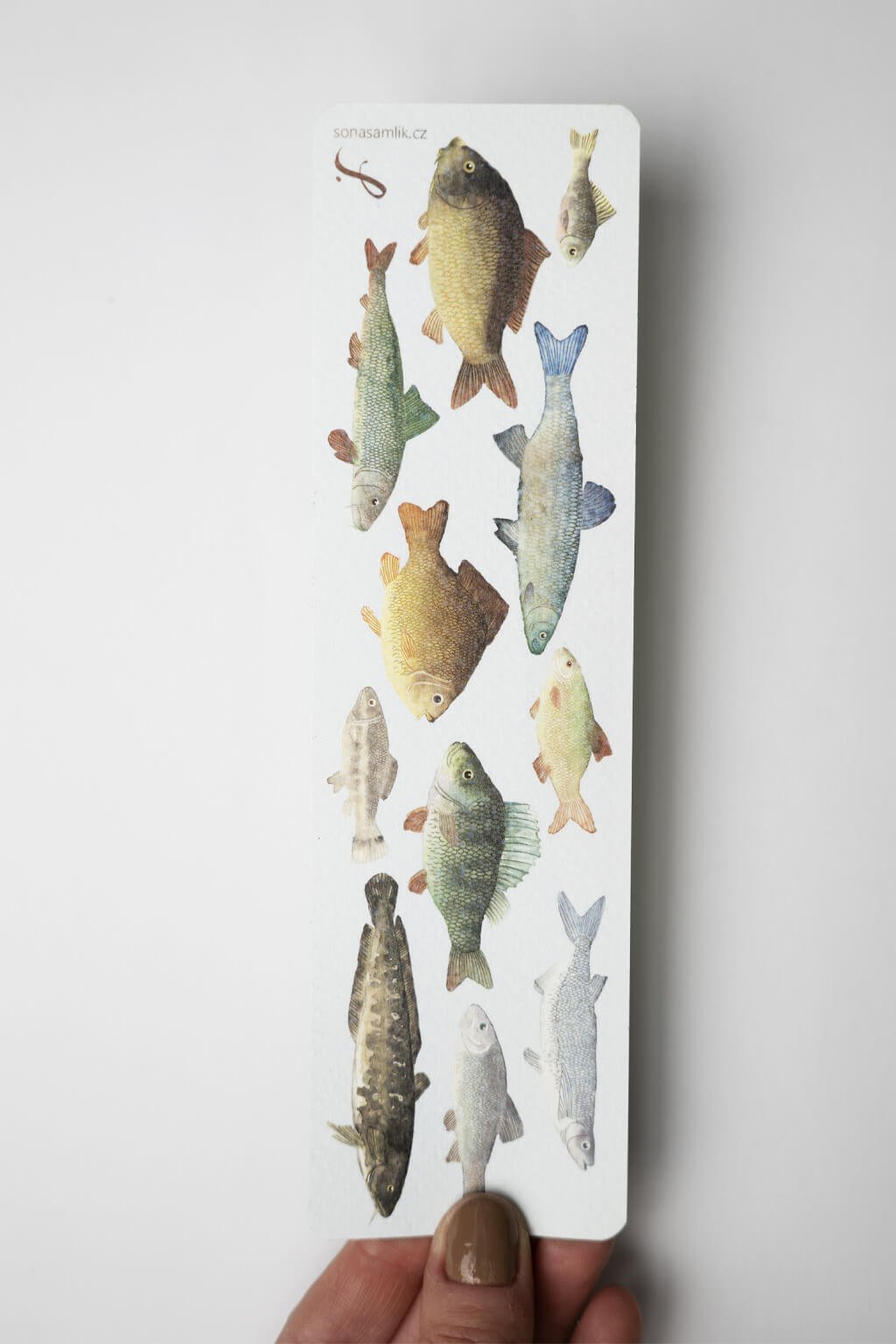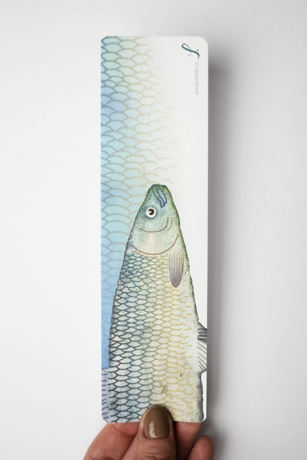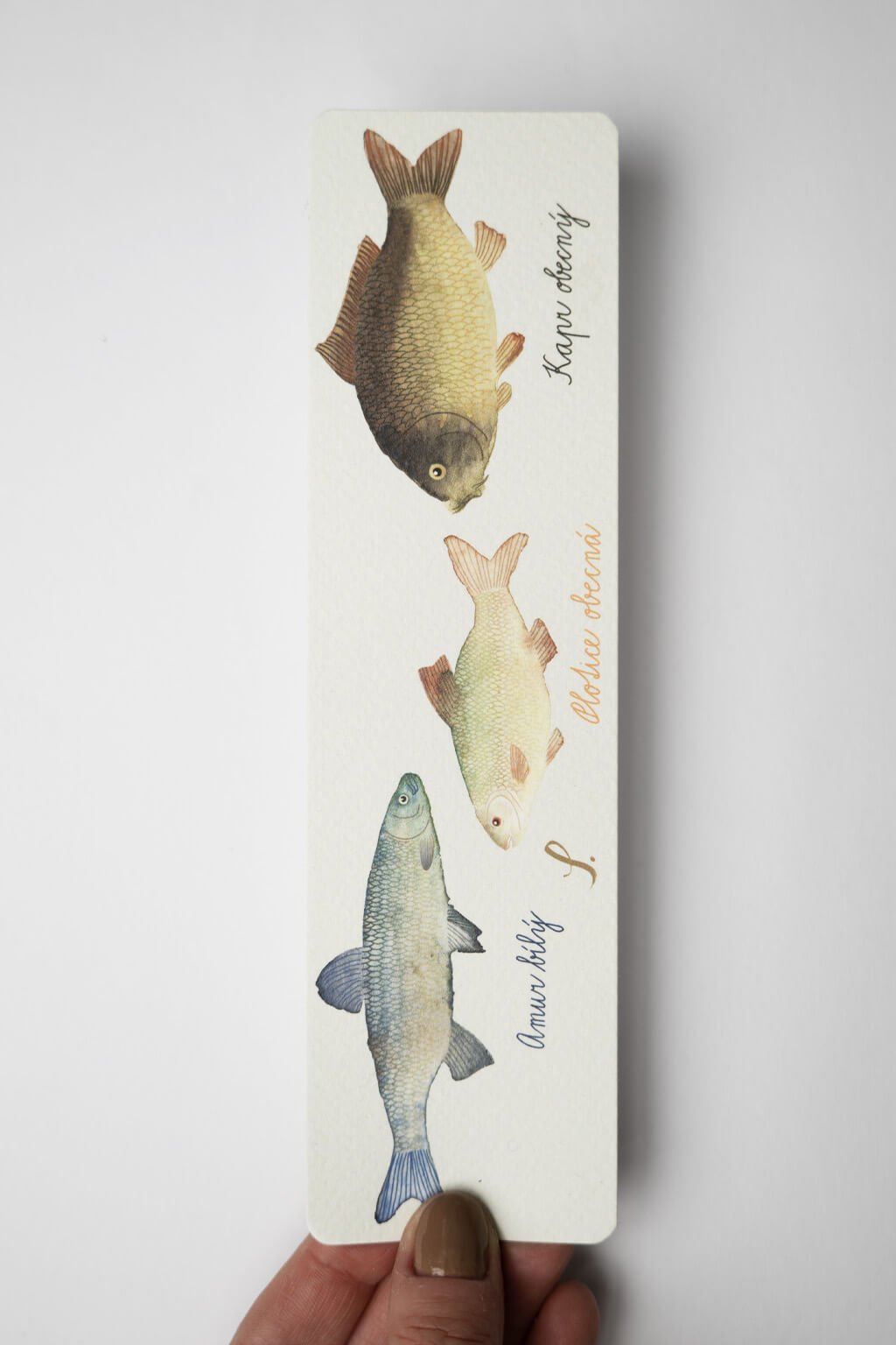 Knižná záložka s jedinečným autorským motívom rýb, namaľovanou technikou akvarelu.