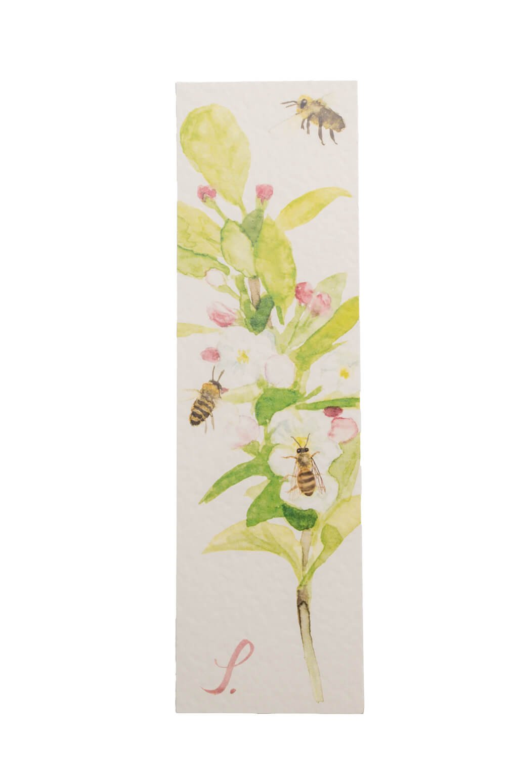 Hravá knižná záložka s originálnym autorským motívom včiel a kvetov, ktorá je namaľovaná technikou akvarelu.