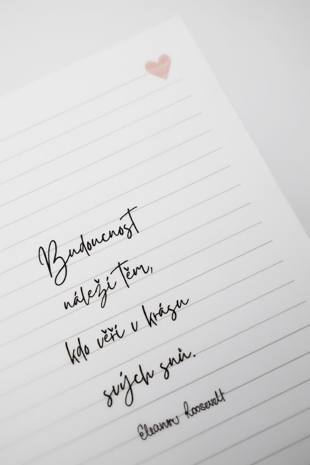 Na začiatku zápisníka vás privíta inšpiratívny citát od Eleanor Roosevelt: „Budúcnosť patrí tým, ktorí veria v krásu svojich snov.“