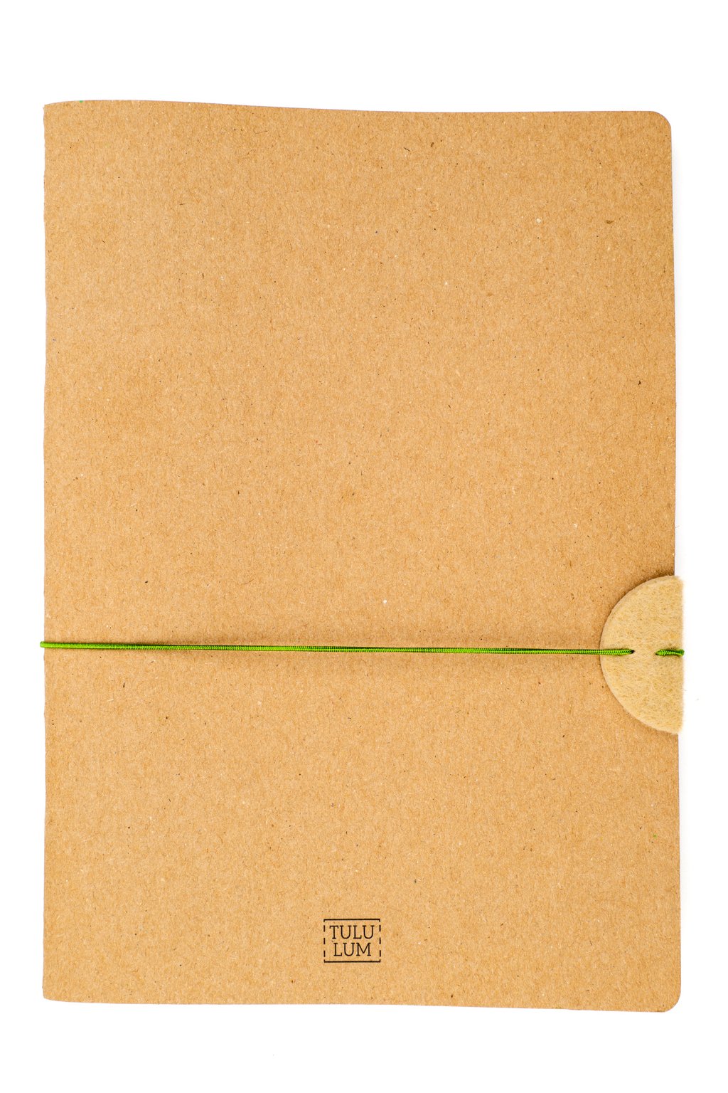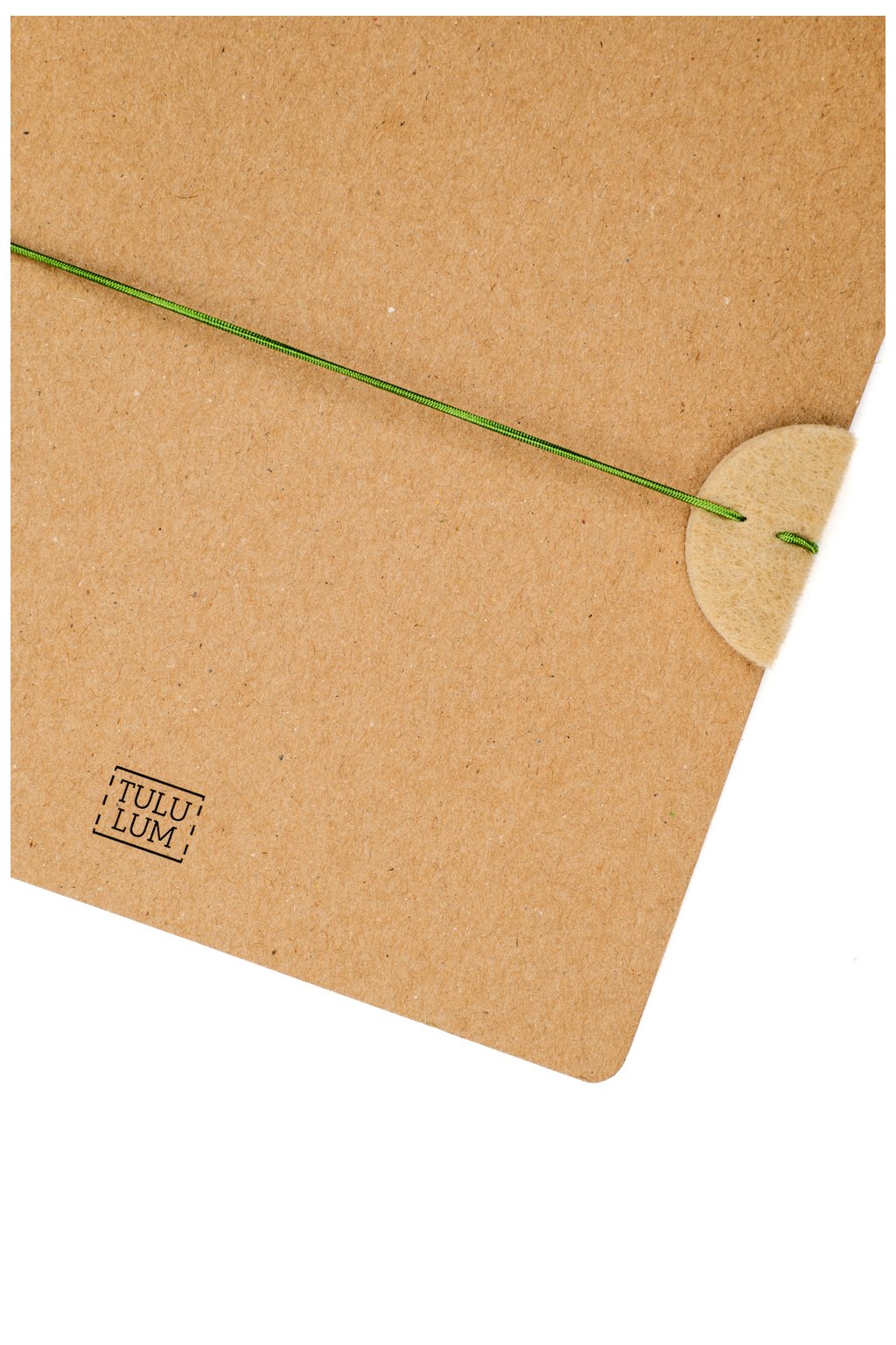 Elegantný zápisník z recyklovaného papiera s praktickou gumičkou v zelenej farbe na obálke. Malý filcový detail drží gumičku na svojom mieste.